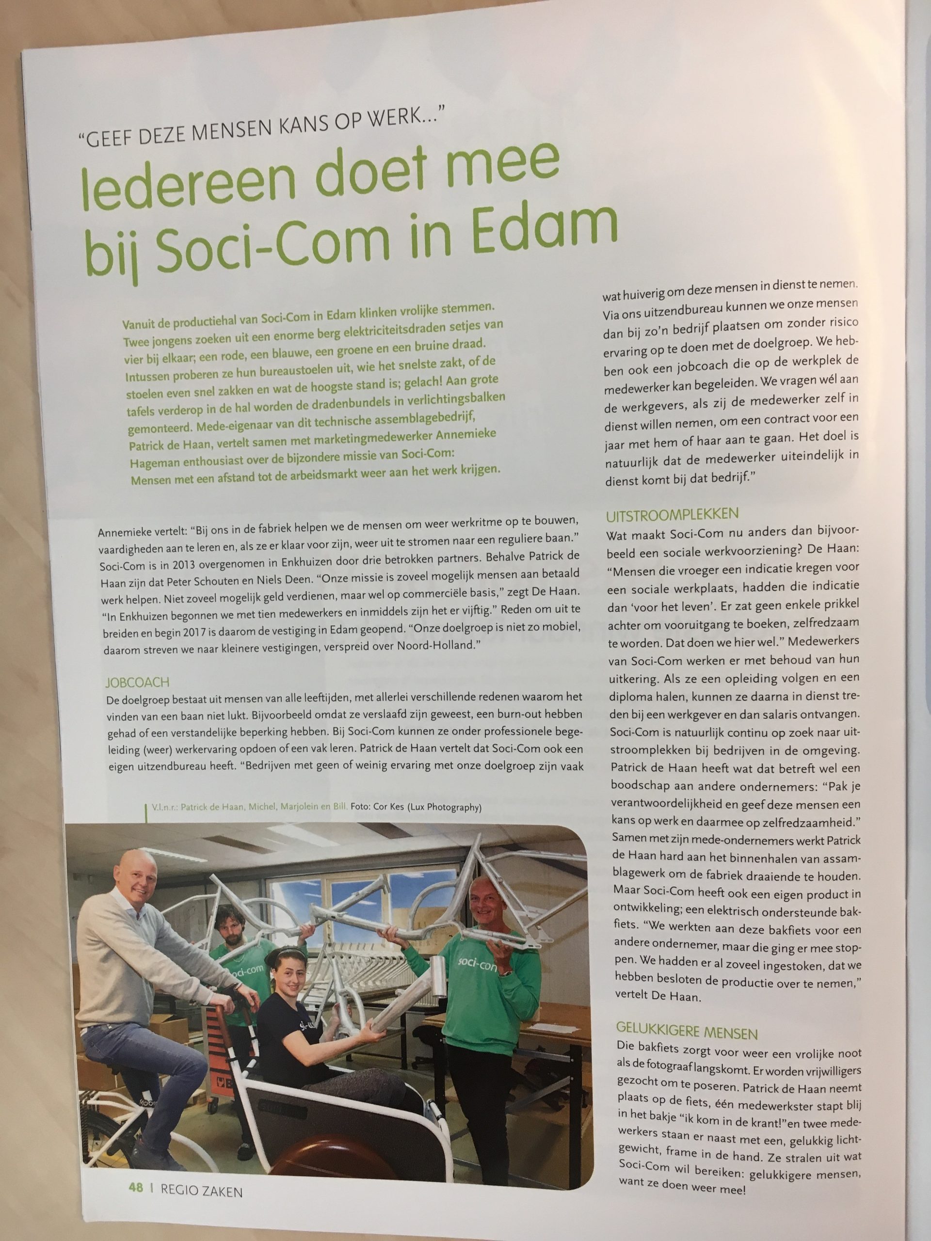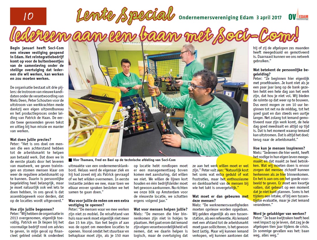 “Vanuit de productiehal van Soci-Com in Edam klinken vrolijke stemmen. Twee jongens zoeken uit een enorme berg elektriciteitsdraden setjes van vier bij elkaar; een rode,…
