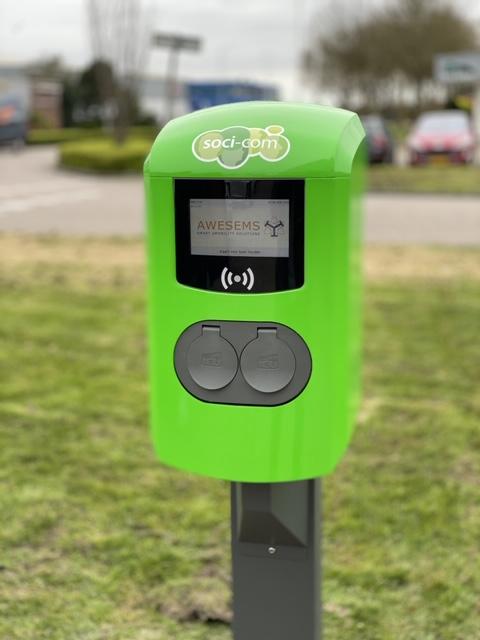 AWESEMS Smart eMobility Solutions heeft bij ons deze mooie, groene laadunit geïnstalleerd. We wilden graag onze huisstijl en logo terugzien in de paal en dat was mogelijk. In hun Bespoke kleurenprogramma zitten namelijk standaard 150 kleuren. We kunnen nu onze elektrische auto’s bij kantoor opladen en zo wordt Soci-Com steeds groener!